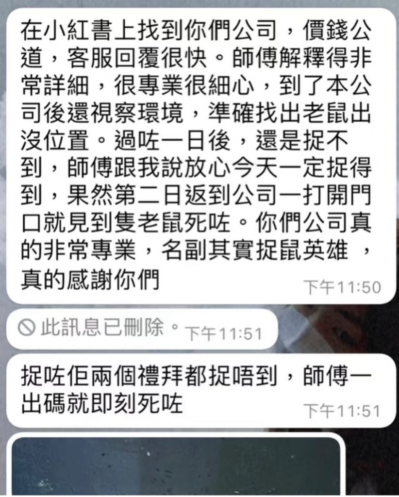 化學性滅鼠方法: 即使用滅鼠藥餌,其特性為鼠類中毒後會漸漸失明,因此不喜歡逗留於黑暗地方,減少鼠類中毒後死於黑暗地方難以發現並發出臭味的機會,一次投餌即見功效。為防止小童、寵物及雀鳥誤食鼠餌............