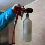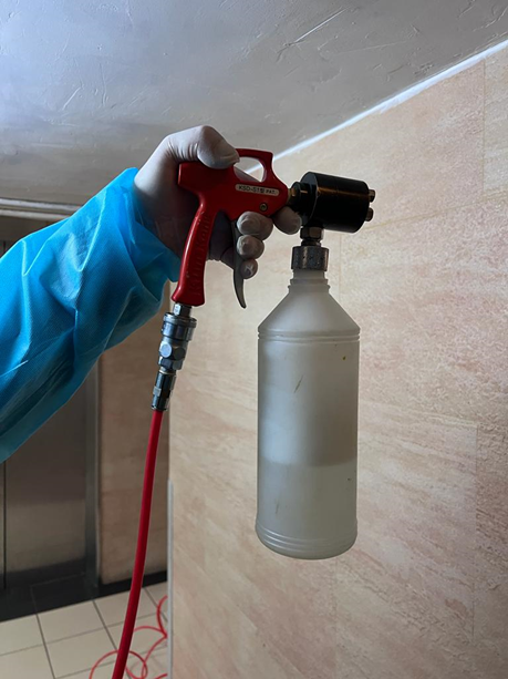 採用日本等地進口之專業滅蟲手泵,將低味滅蟲藥液噴灑在害蟲可能接觸的表面及出沒的地方(例如牆邊及角落),害蟲接觸後便會中毒死亡。此滅蟲方式效力可通常可維持數星期不等。